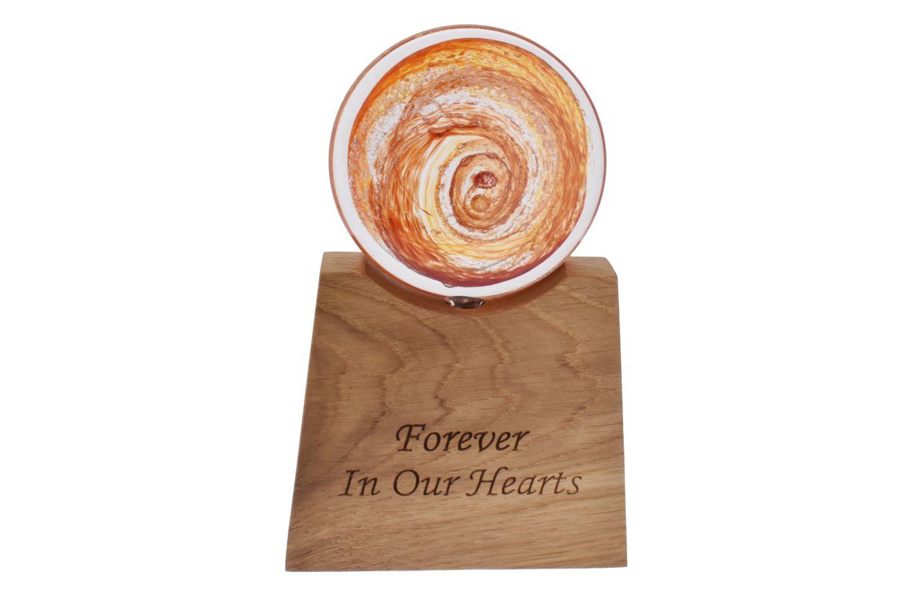 Disk with encased ashes on tall tapered oak base.