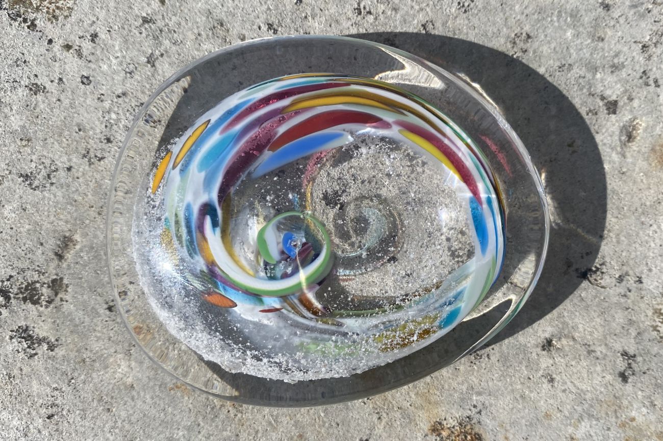 Once the order has been placed, we will send you an addressed special 'ash collection envelope' with clear instructions explaining how to extract and safely package your loved ones ashes. Once safely wrapped, please send back to us via a signed for service. After receiving the ashes, they are carefully incorporated into the molten glass and entwined with the colour of your choice. The piece is then encased with more glass and hand sculpted, preserving the ashes for ever inside the pebble.