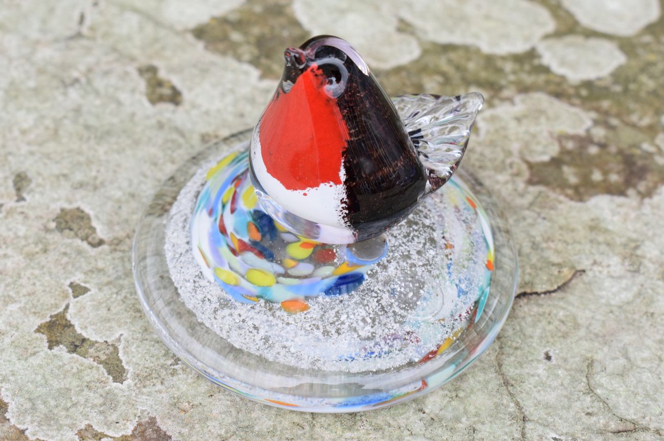 Glass base is approximately 9cm in diameter and the robin is 5cm high.
