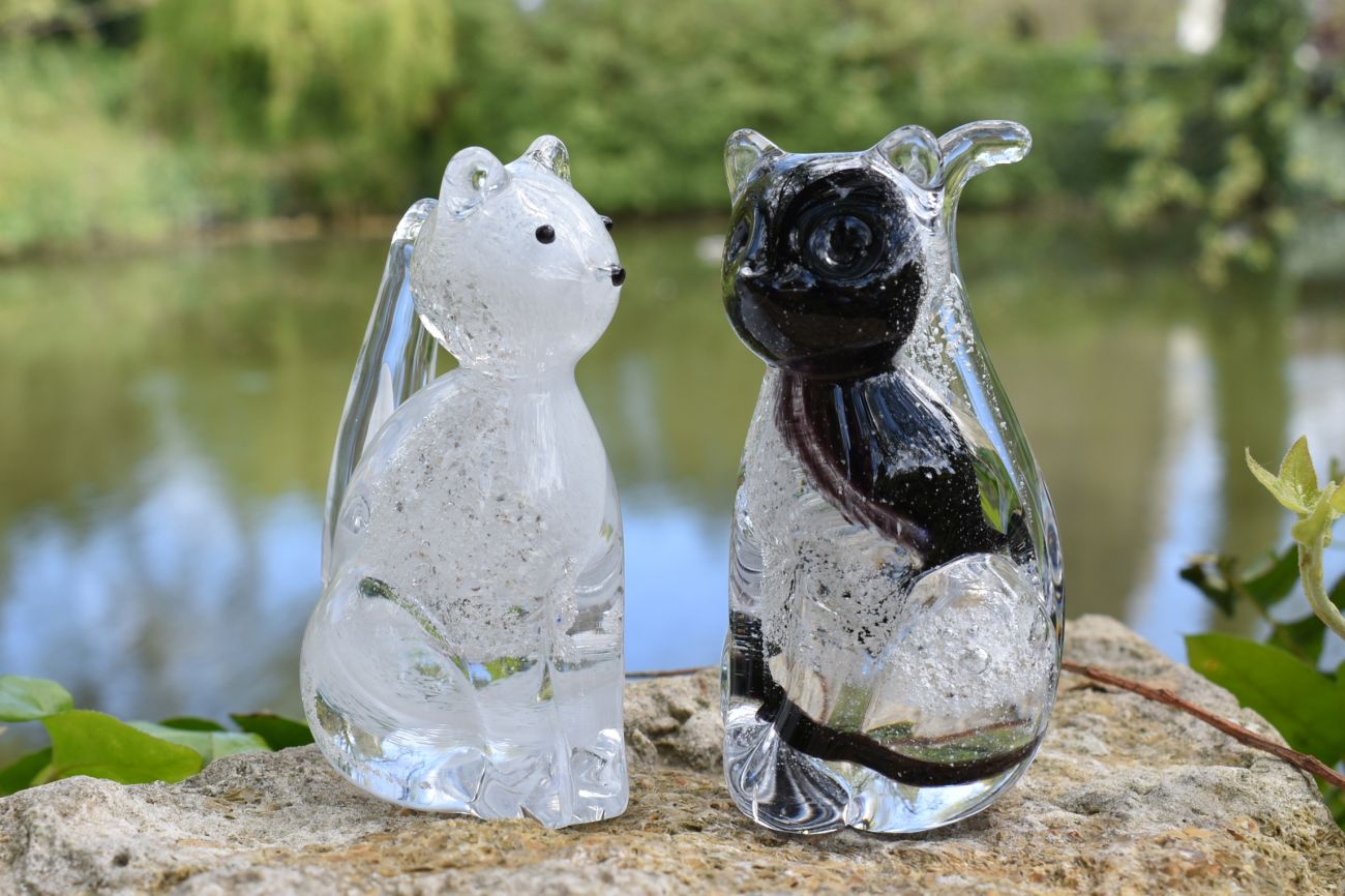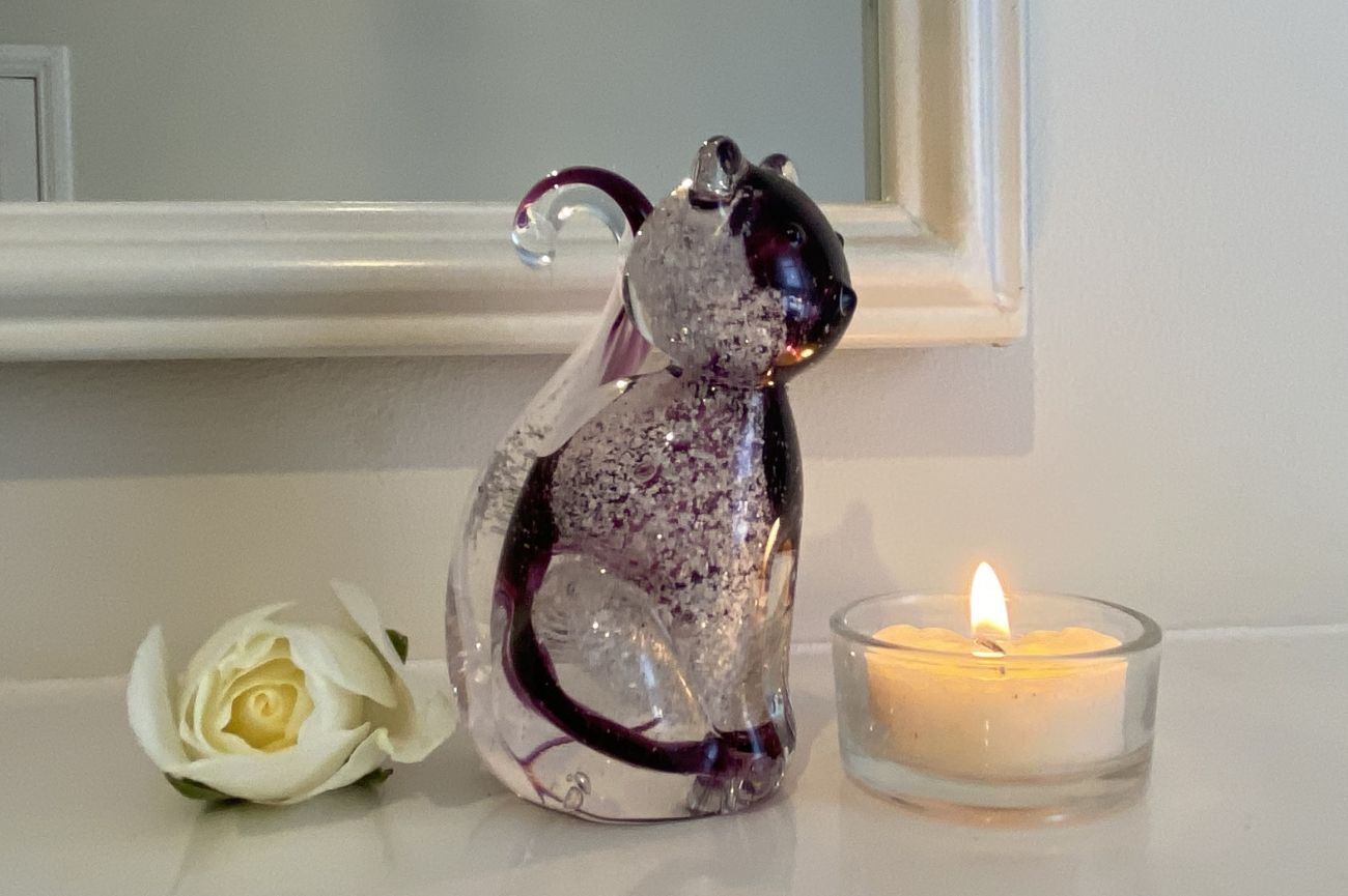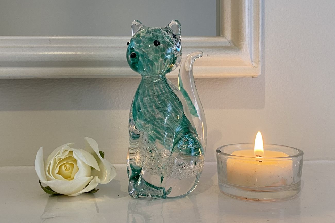 Remember your loved pet cat with this very special memorial glass cat keepsake, bringing some comfort and a lasting memory. With great care and respect, the ashes are carefully encased inside the glass cat.