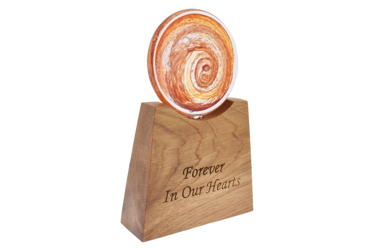 Disk with encased ashes on tall tapered oak base.