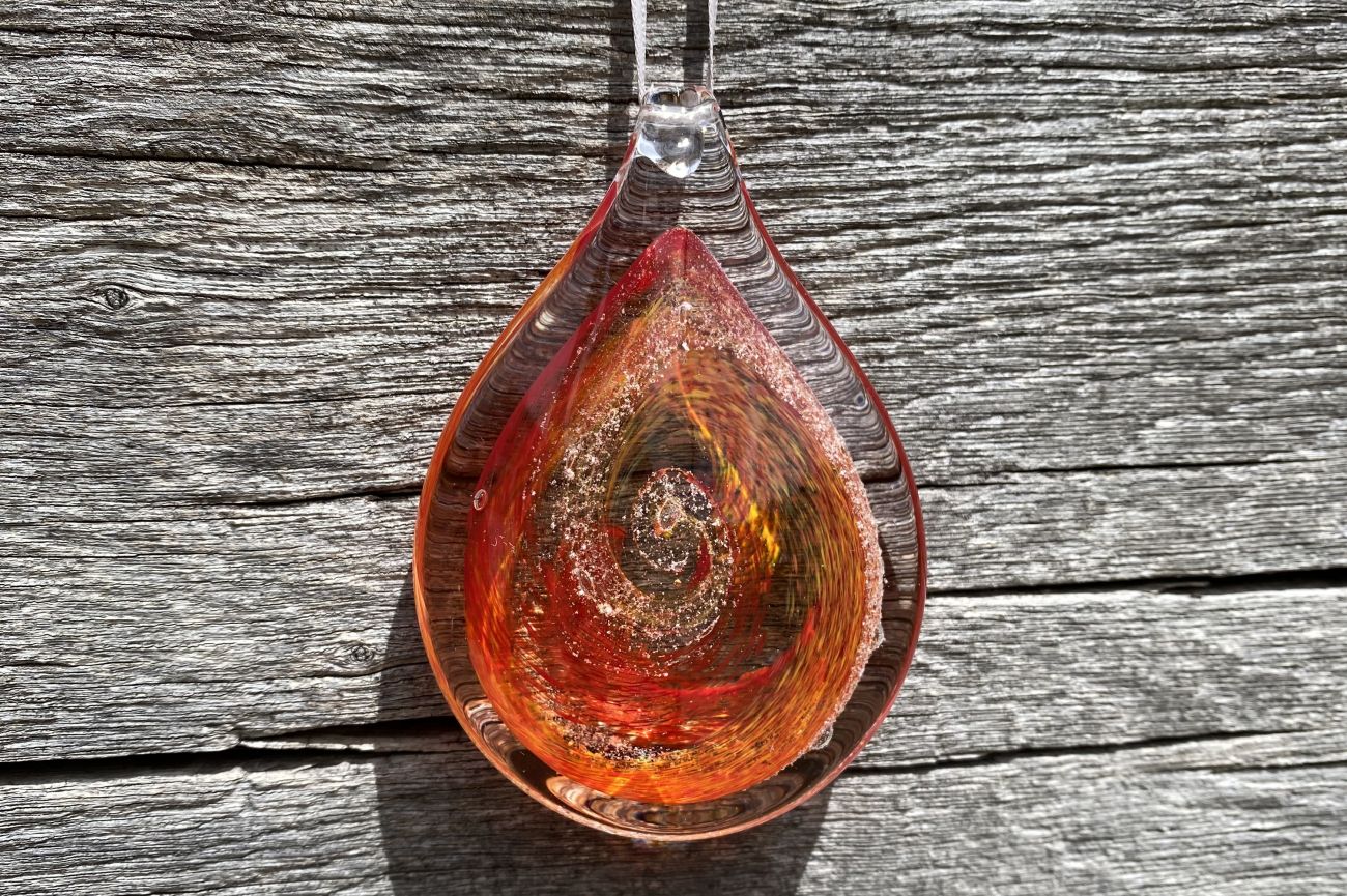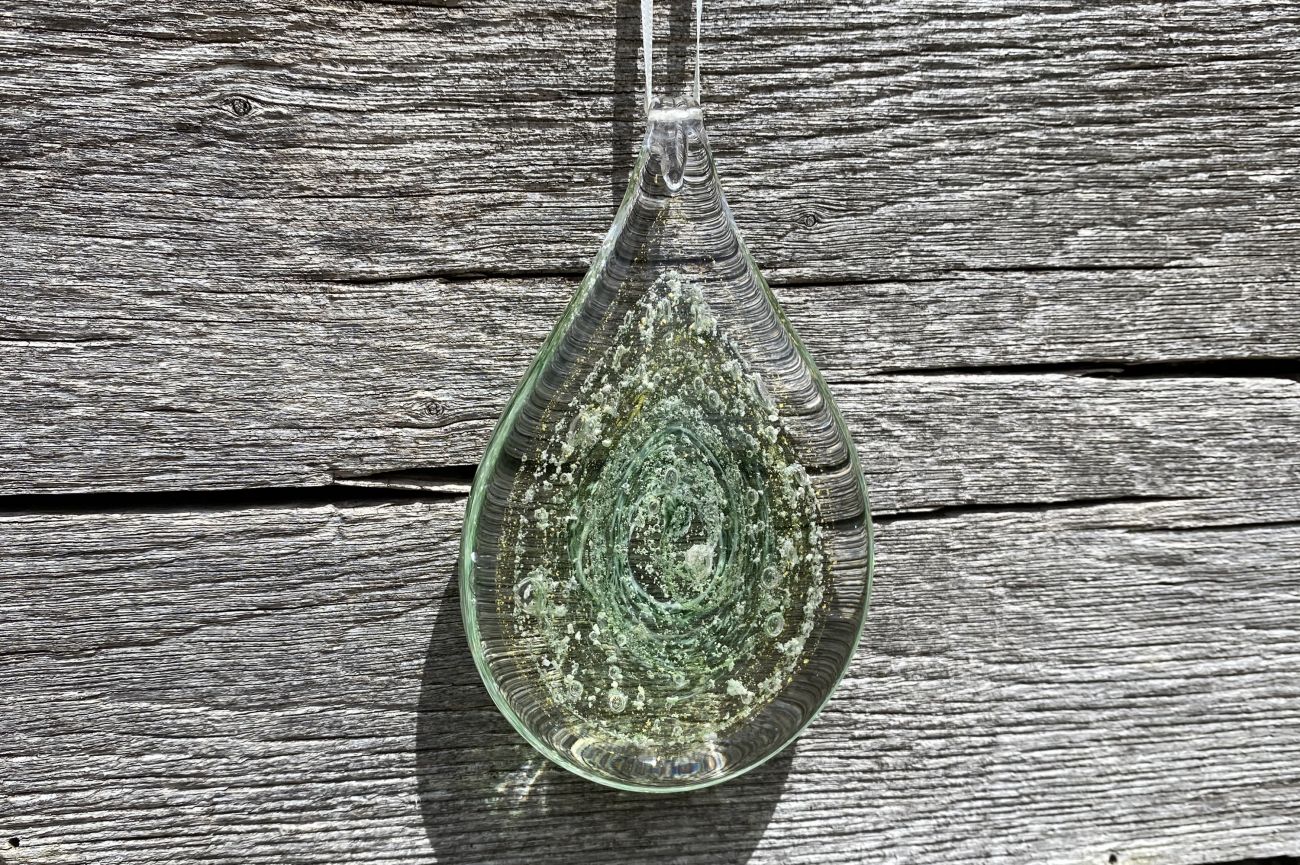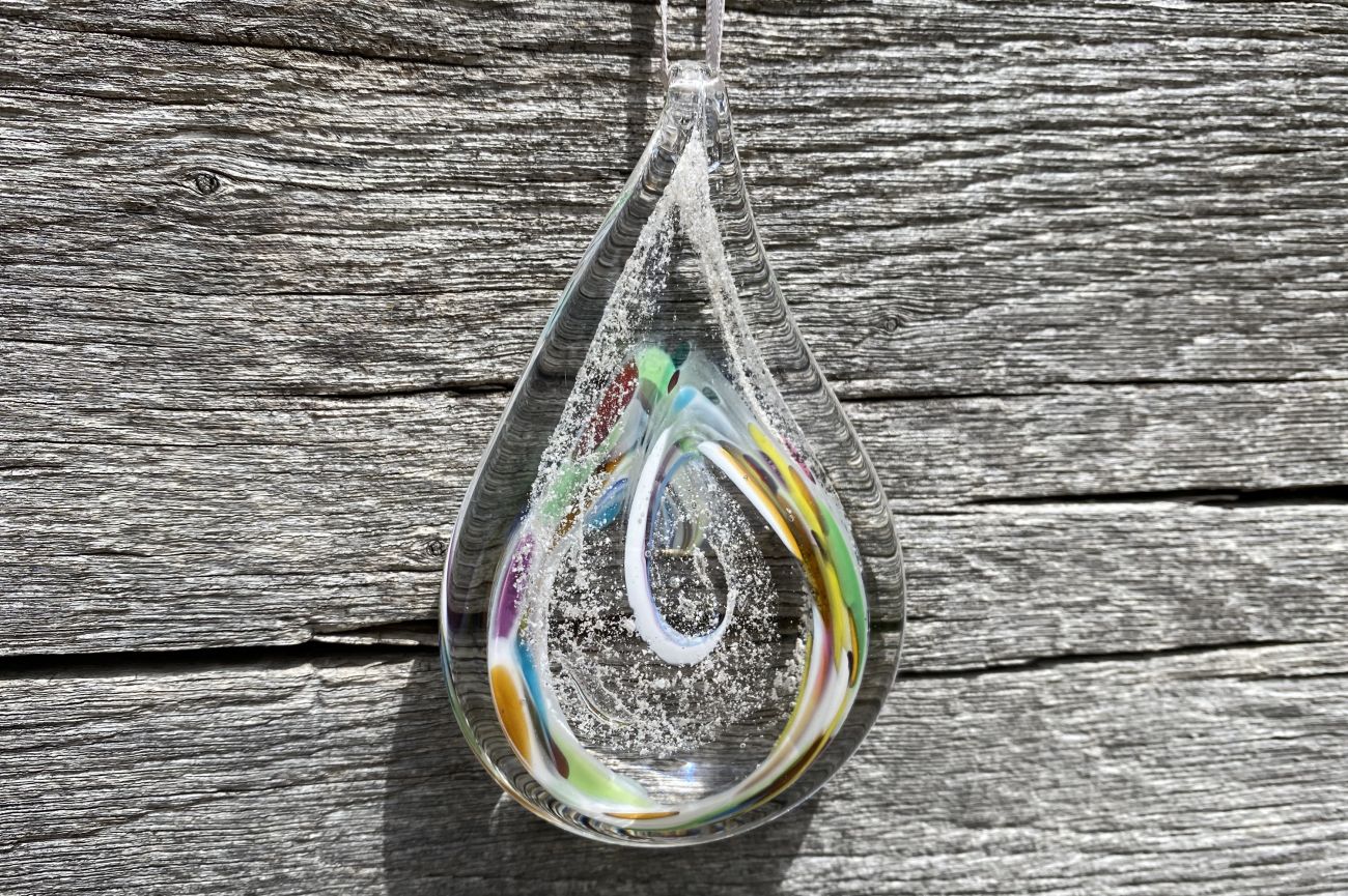 Once the order has been placed, we will send you an addressed special 'ash collection envelope' with clear instructions explaining how to extract and safely package your loved ones ashes. Once safely wrapped, please send back to us via a signed for service. After receiving the ashes, they are carefully incorporated into the molten glass and entwined with the colour of your choice. The piece is then encased with more glass and hand sculpted, preserving the ashes for ever inside the teardrop.