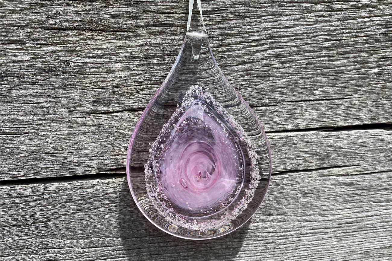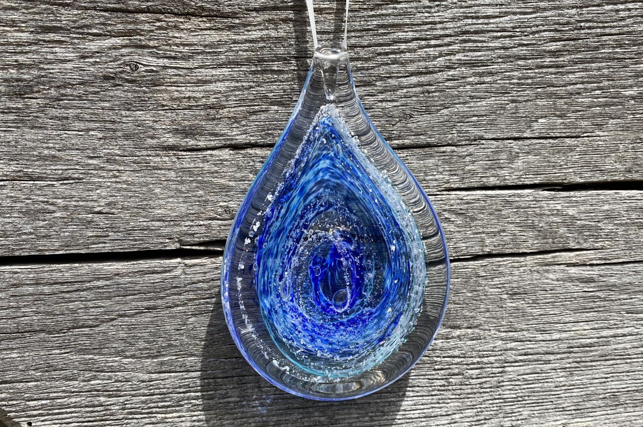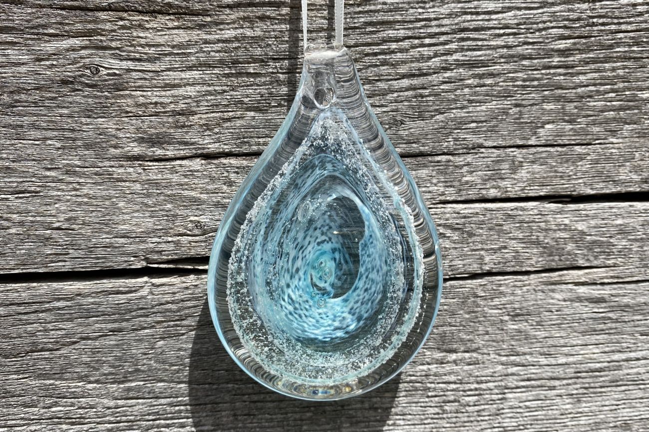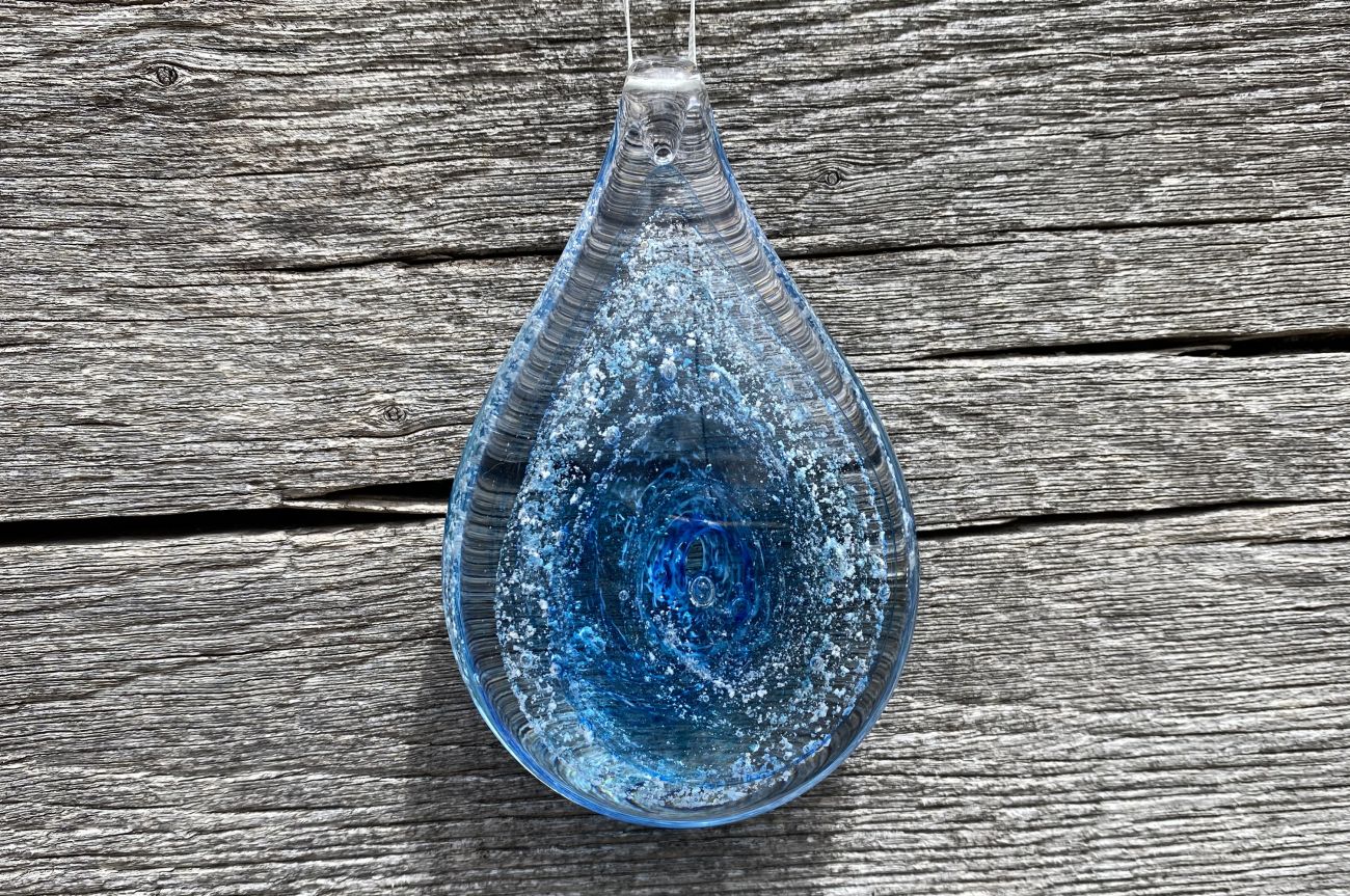 Once the order has been placed, we will send you an addressed special 'ash collection envelope' with clear instructions explaining how to extract and safely package your loved ones ashes. Once safely wrapped, please send back to us via a signed for service. After receiving the ashes, they are carefully incorporated into the molten glass and entwined with the colour of your choice. The piece is then encased with more glass and hand sculpted, preserving the ashes for ever inside the teardrop.