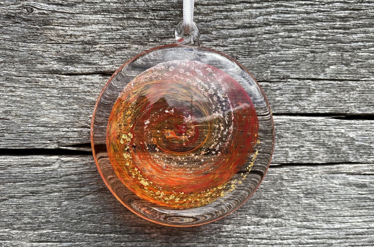 Once the order has been placed, we will send you an addressed special 'ash collection envelope' with clear instructions explaining how to extract and safely package your loved ones ashes. Once safely wrapped, please send back to us via a signed for service. After receiving the ashes, they are carefully incorporated into the molten glass and entwined with the colour of your choice. The piece is then encased with more glass and hand sculpted, preserving the ashes for ever inside the Disk.