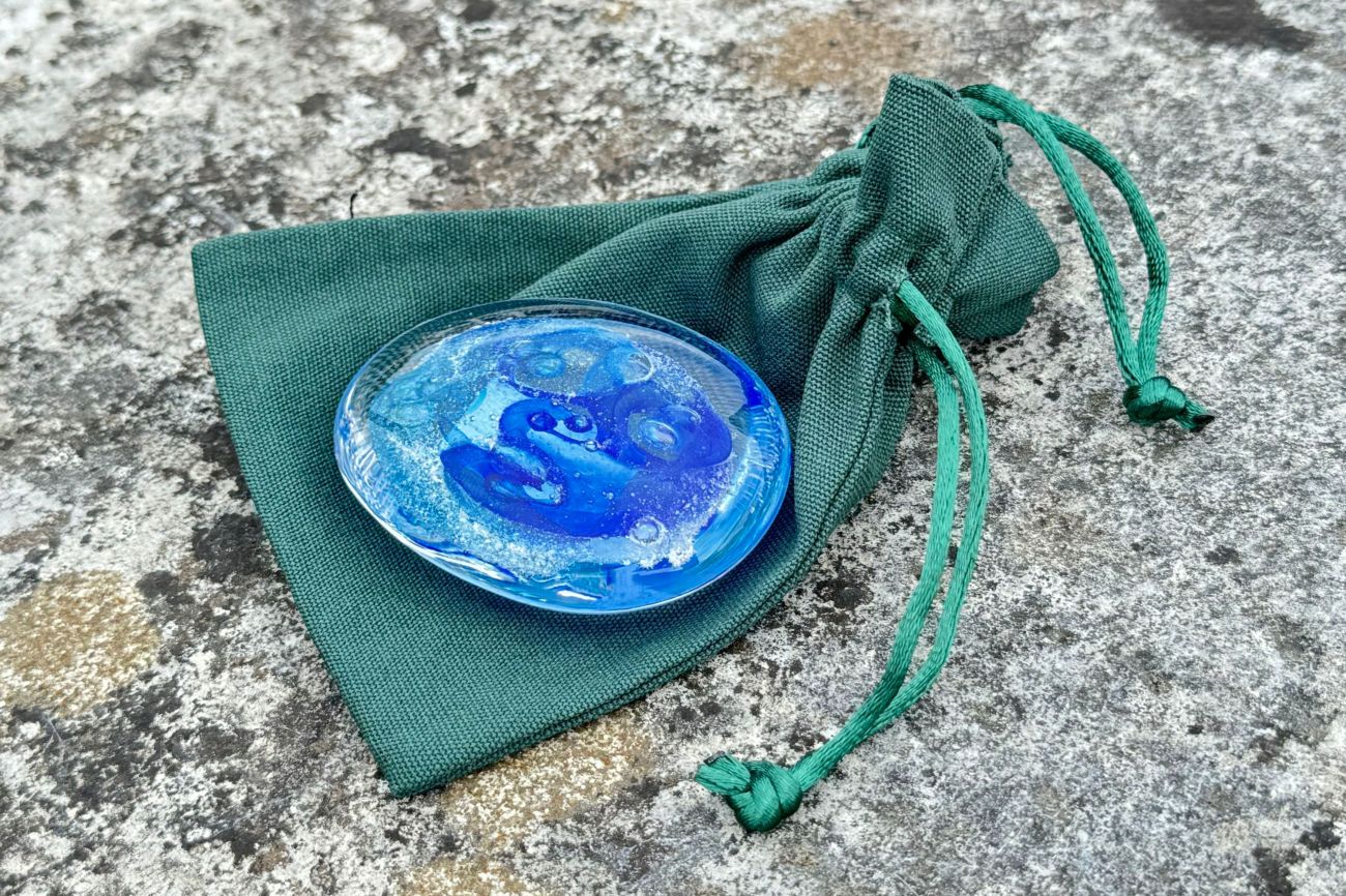 Once the order has been placed, we will send you an addressed special 'ash collection envelope' with clear instructions explaining how to extract and safely package your loved ones ashes. Once safely wrapped, please send back to us via a signed for service. After receiving the ashes, they are carefully incorporated into the molten glass and entwined with the colour of your choice. The piece is then encased with more glass and hand sculpted, preserving the ashes for ever inside the pebble.