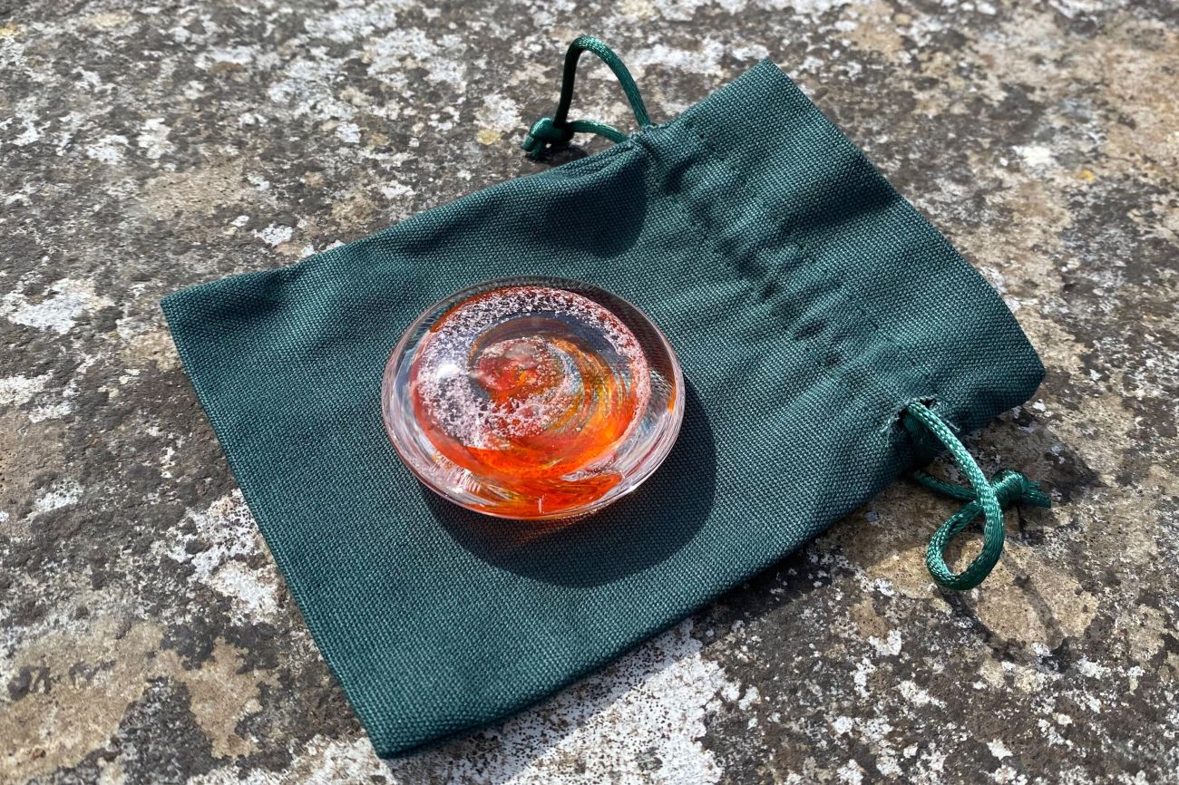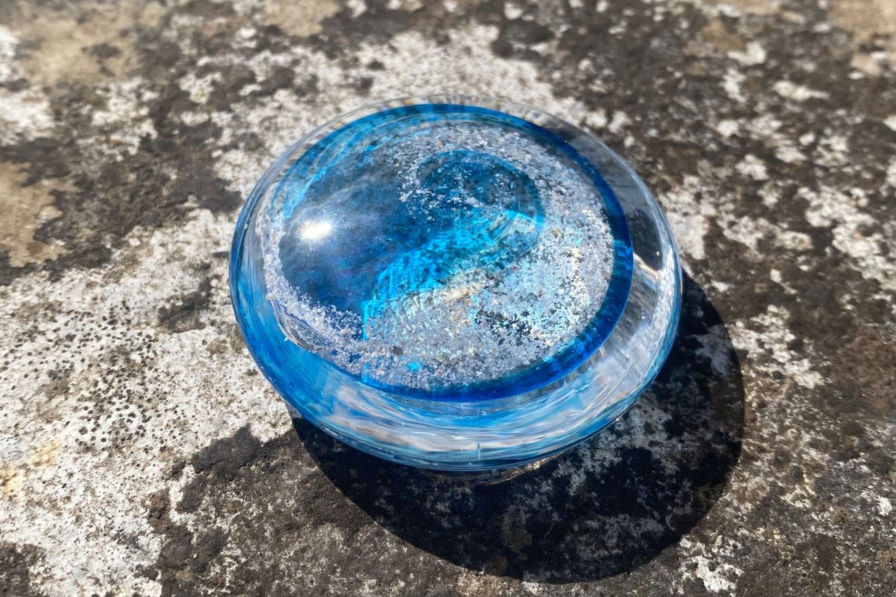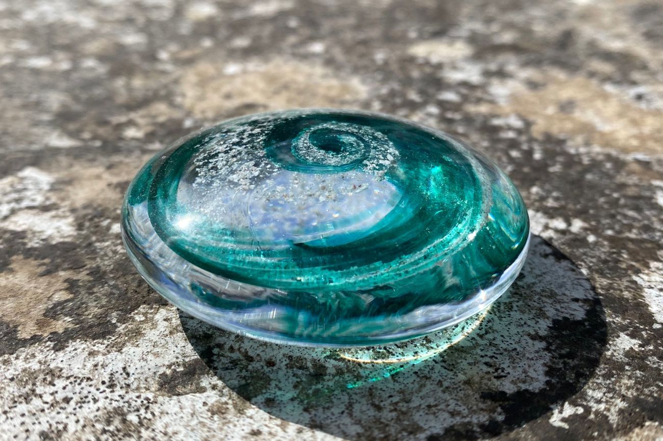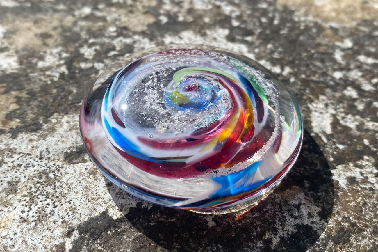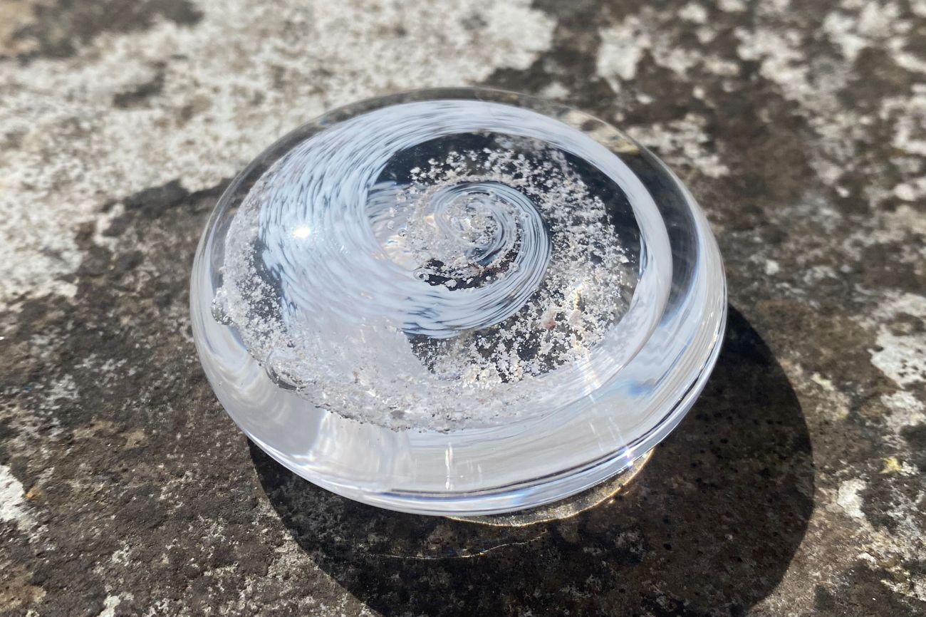 With great care and respect, the ashes are carefully encased inside the glass, bringing some comfort and a lasting memory. The colour of your choice is carefully spiralled within the glass alongside your loved one's ashes.