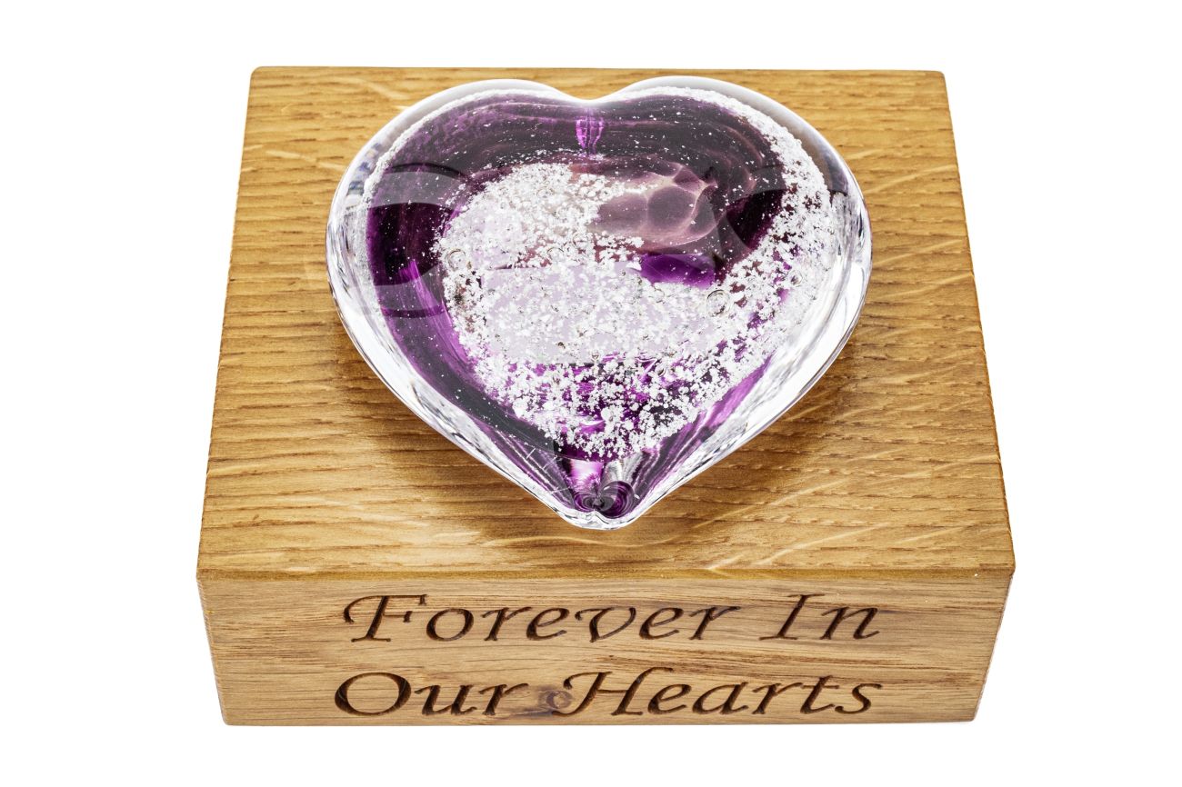 Remember your loved one with a very special memorial glass heart ornament, that can nestle into an oak base with a few special words engraved on it's front face.