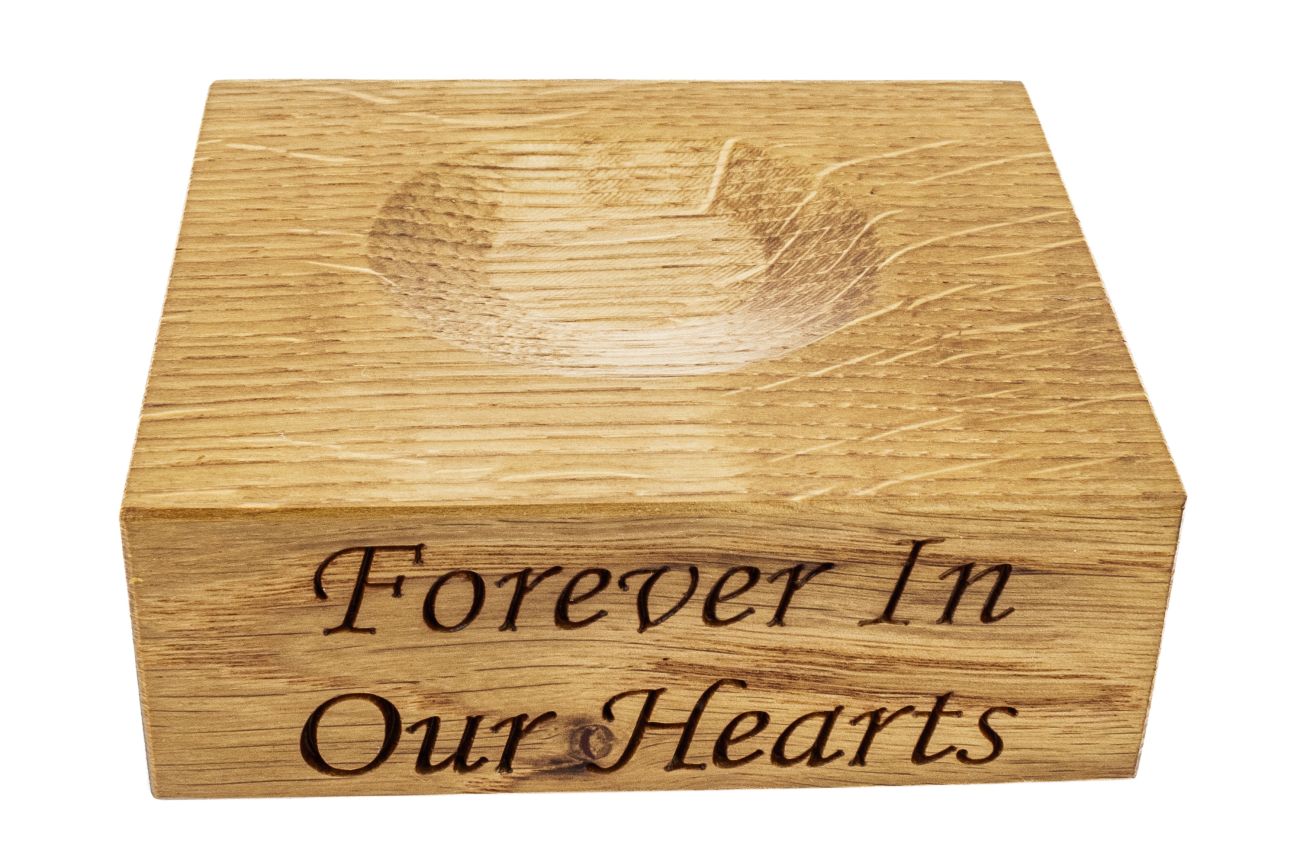 Heart nestled on engraved oak base